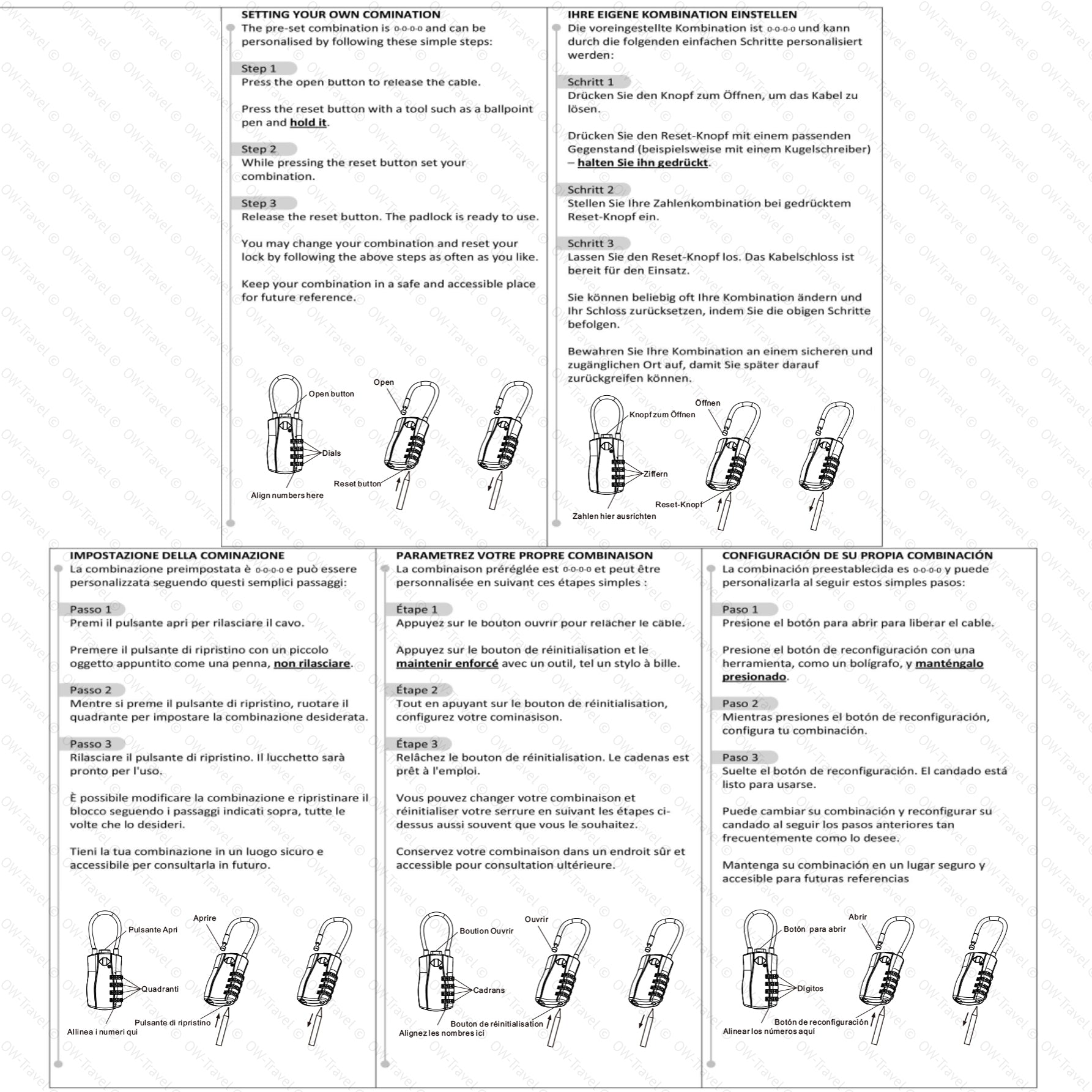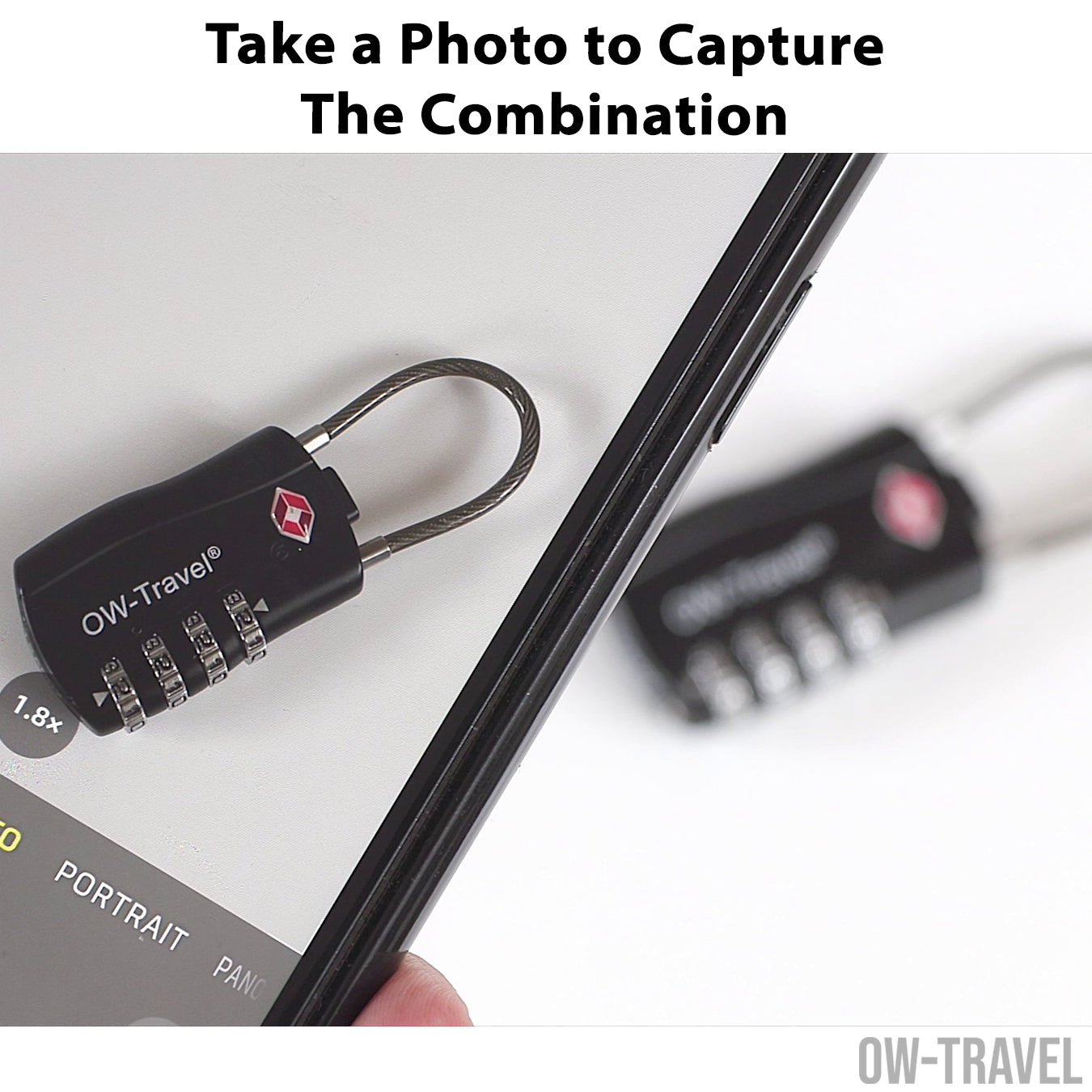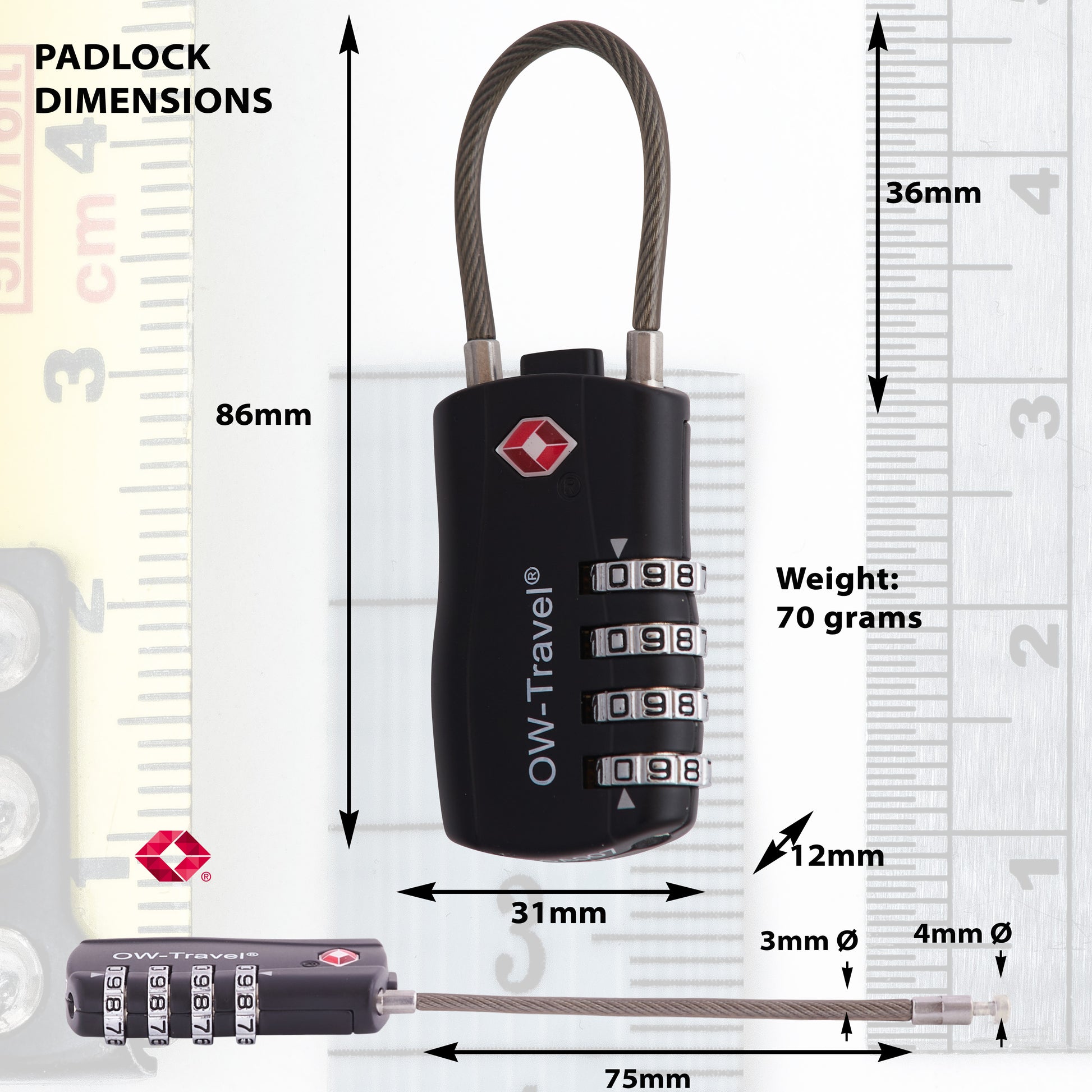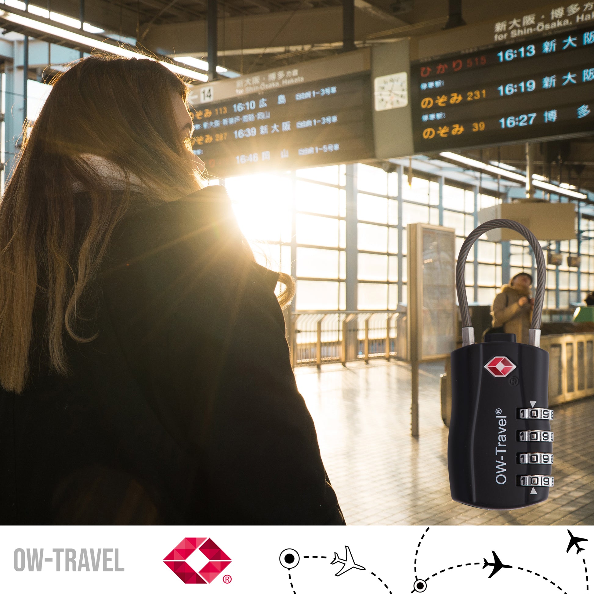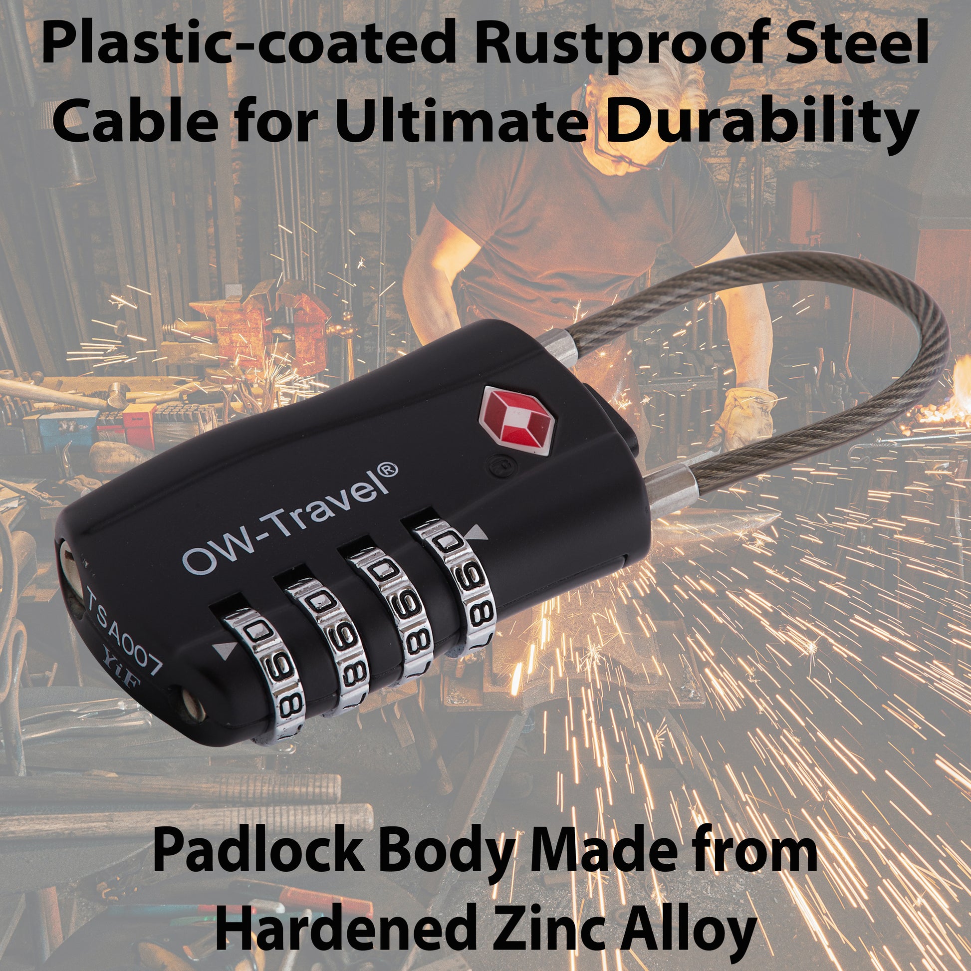 【Durable & Robust】 Secure TSA luggage locks. OW-Travel suitcase locks are crafted from the most Robust Zinc Alloy and come with a toughened plastic coated steel cable making it near impossible to cut through or crack using regular tools. The 4 dial numerical pad lock allows you to create over 10,000 combinations, so guessing the combo is almost impossible. A Padlock designed for a suitcase. Double your security system: Unlike ‘copycat’ Number Combination Padlocks.