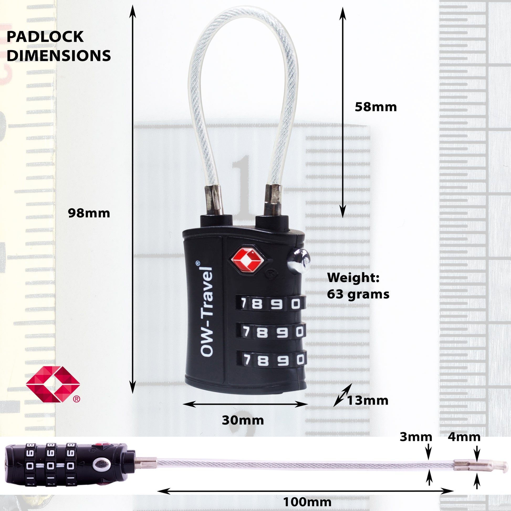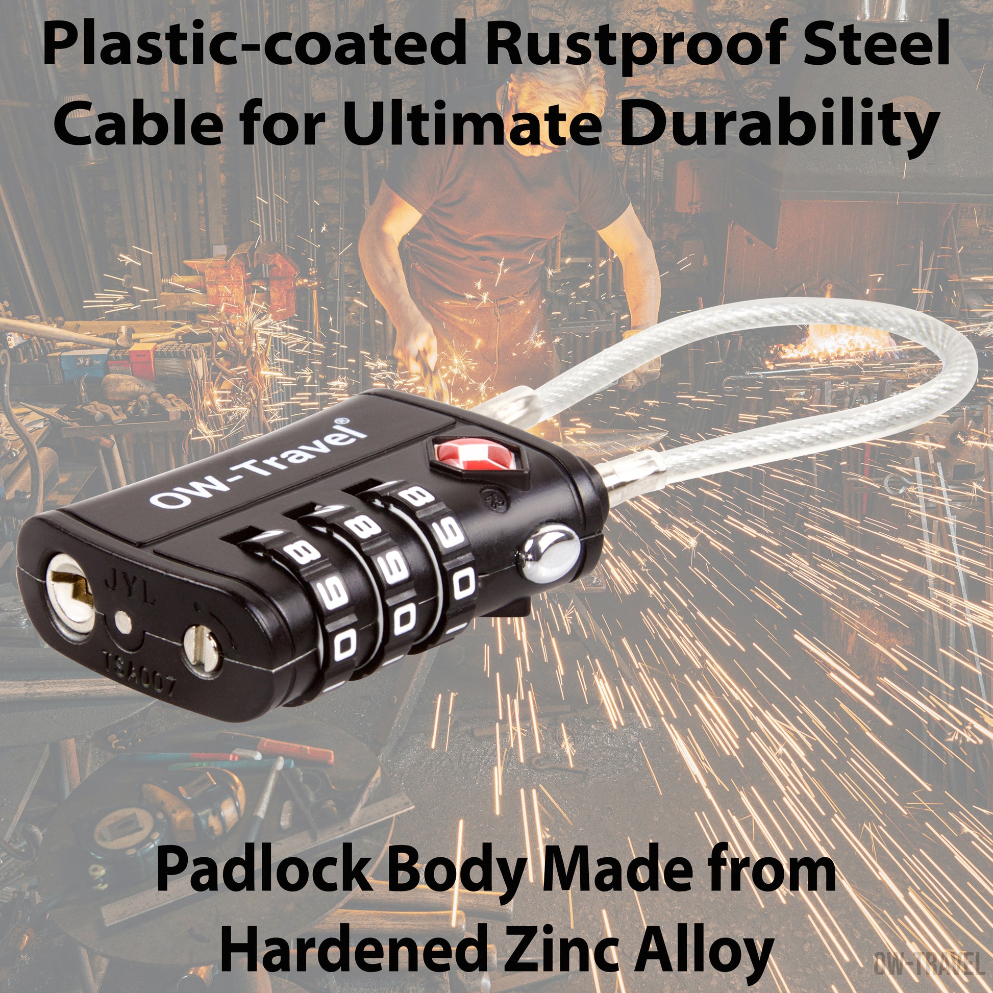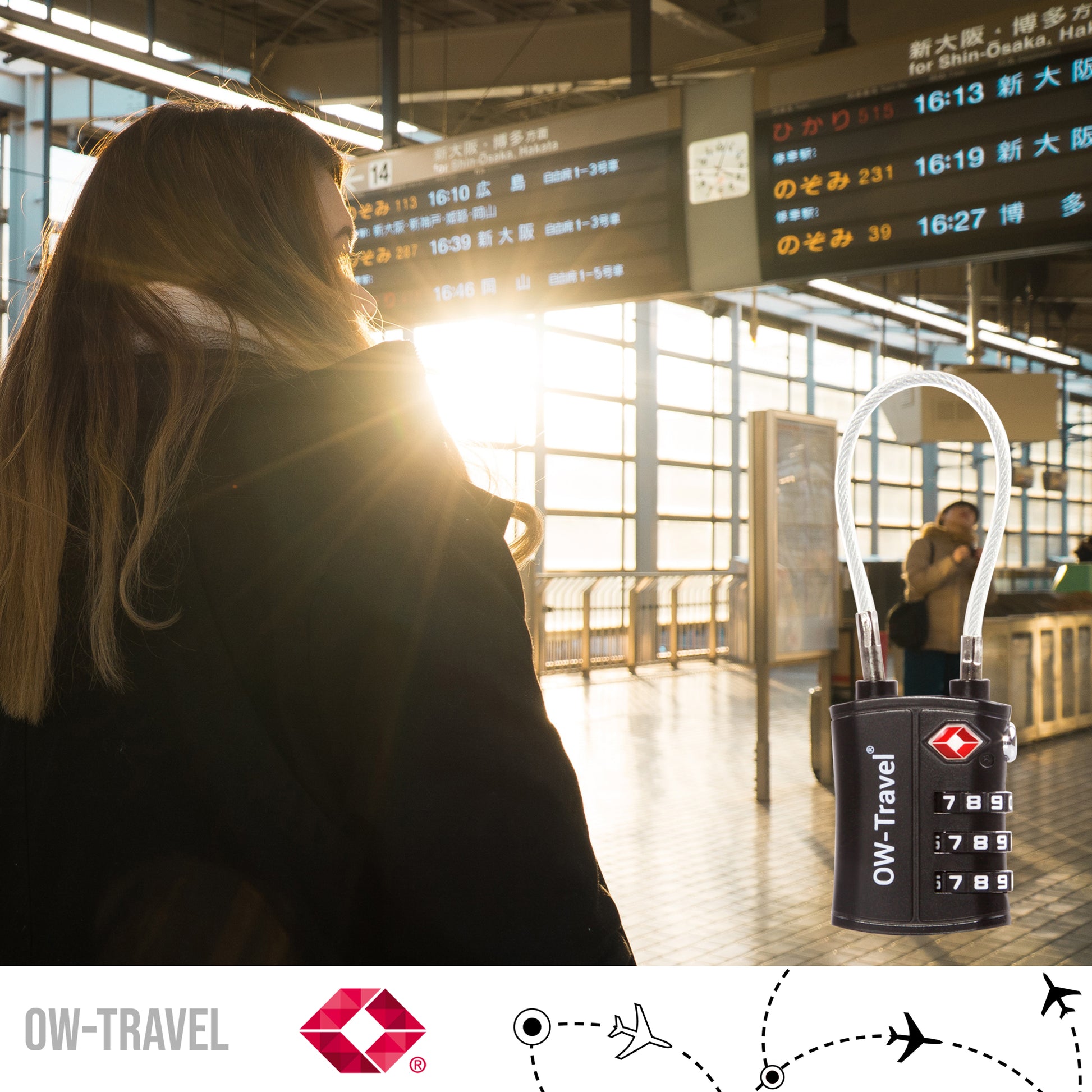 【Durable & Robust】 Secure TSA luggage locks. OW-Travel suitcase locks are crafted from the most Robust Zinc Alloy and come with a toughened plastic coated steel cable making it near impossible to cut through or crack using regular tools. The 3 dial numerical pad lock allows you to create over 1,000 combinations, so guessing the combo is almost impossible. A Padlock designed for a suitcase. Double your security system: Unlike ‘copycat’ Number Combination Padlocks.