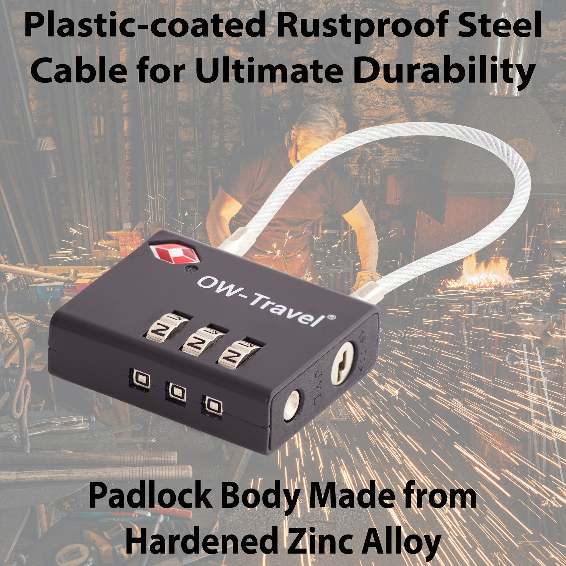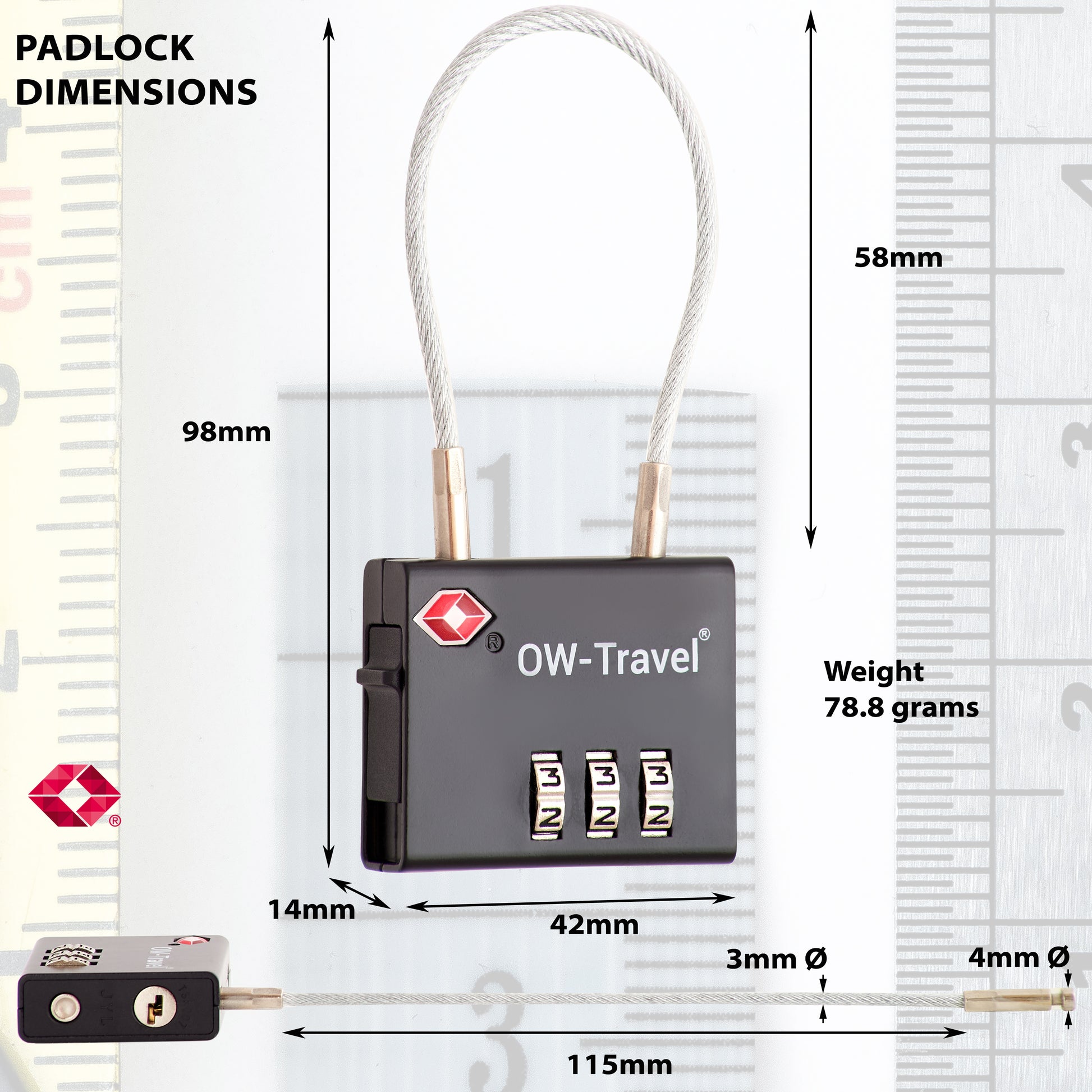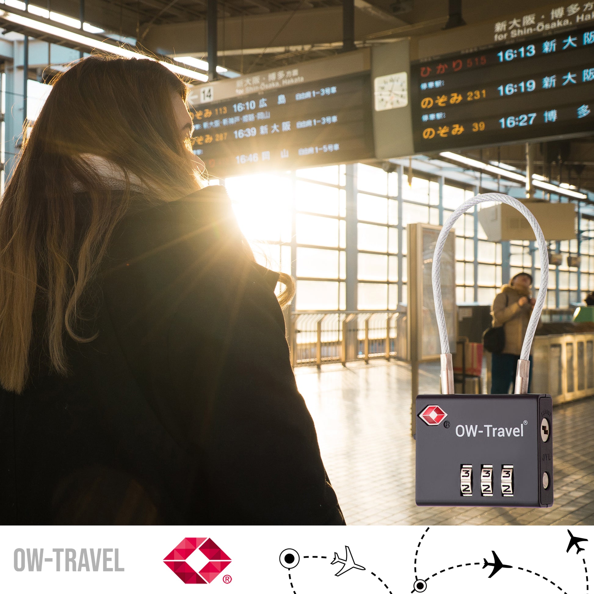 【Durable & Robust】 Secure TSA luggage locks. OW-Travel suitcase locks are crafted from the most Robust Zinc Alloy and come with a toughened plastic coated steel cable making it near impossible to cut through or crack using regular tools. The 3 dial numerical pad lock allows you to create over 1,000 combinations, so guessing the combo is almost impossible. A Padlock designed for a suitcase. Double your security system: Unlike ‘copycat’ Number Combination Padlocks.