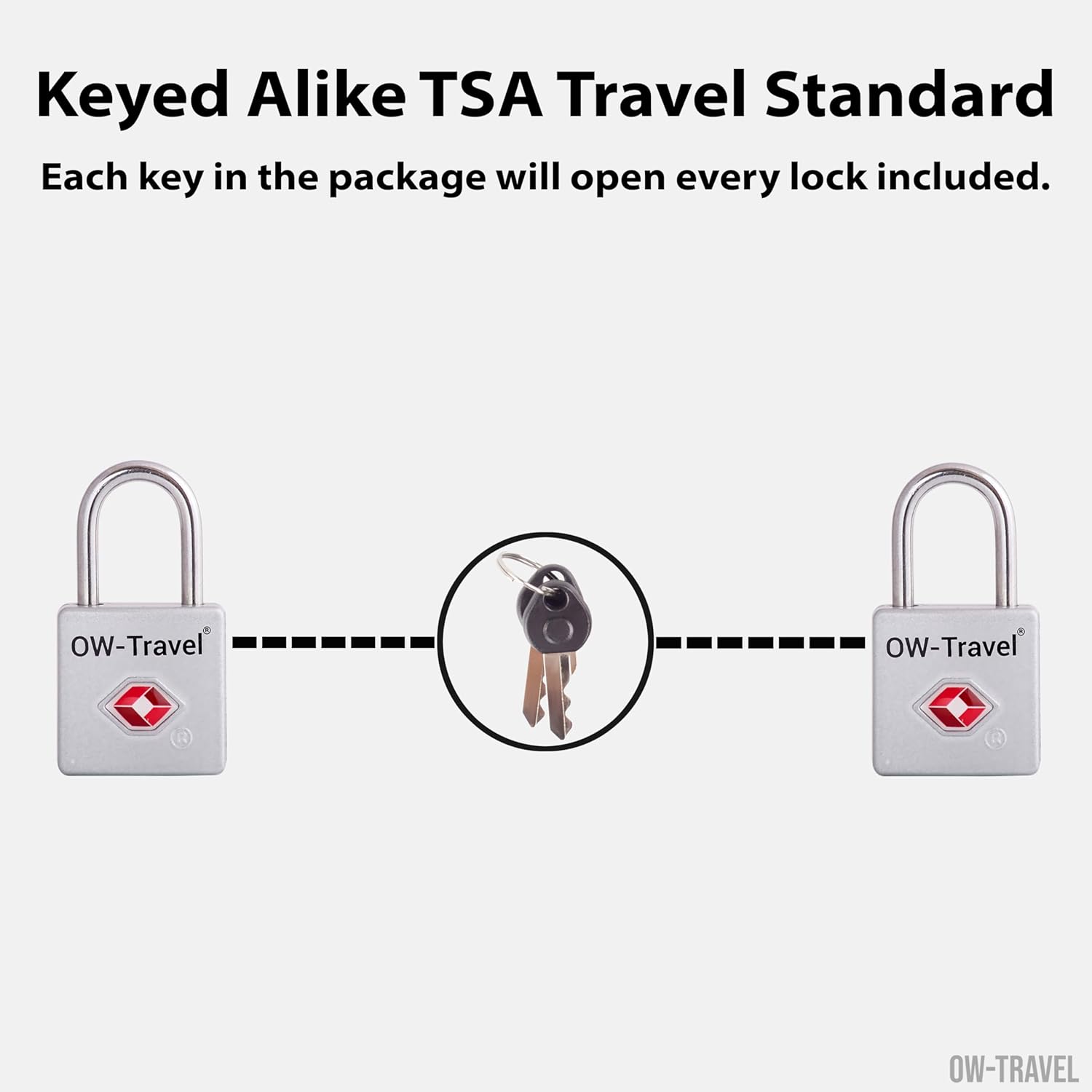 【Durable & Robust】 Secure TSA luggage locks. OW-Travel suitcase locks are crafted from the most Robust Zinc Alloy making it near impossible to cut through or crack using regular tools. The KEYED ALIKE case locks for luggage allow your brain to relax, not a number in sight! A Padlock designed for a suitcase.