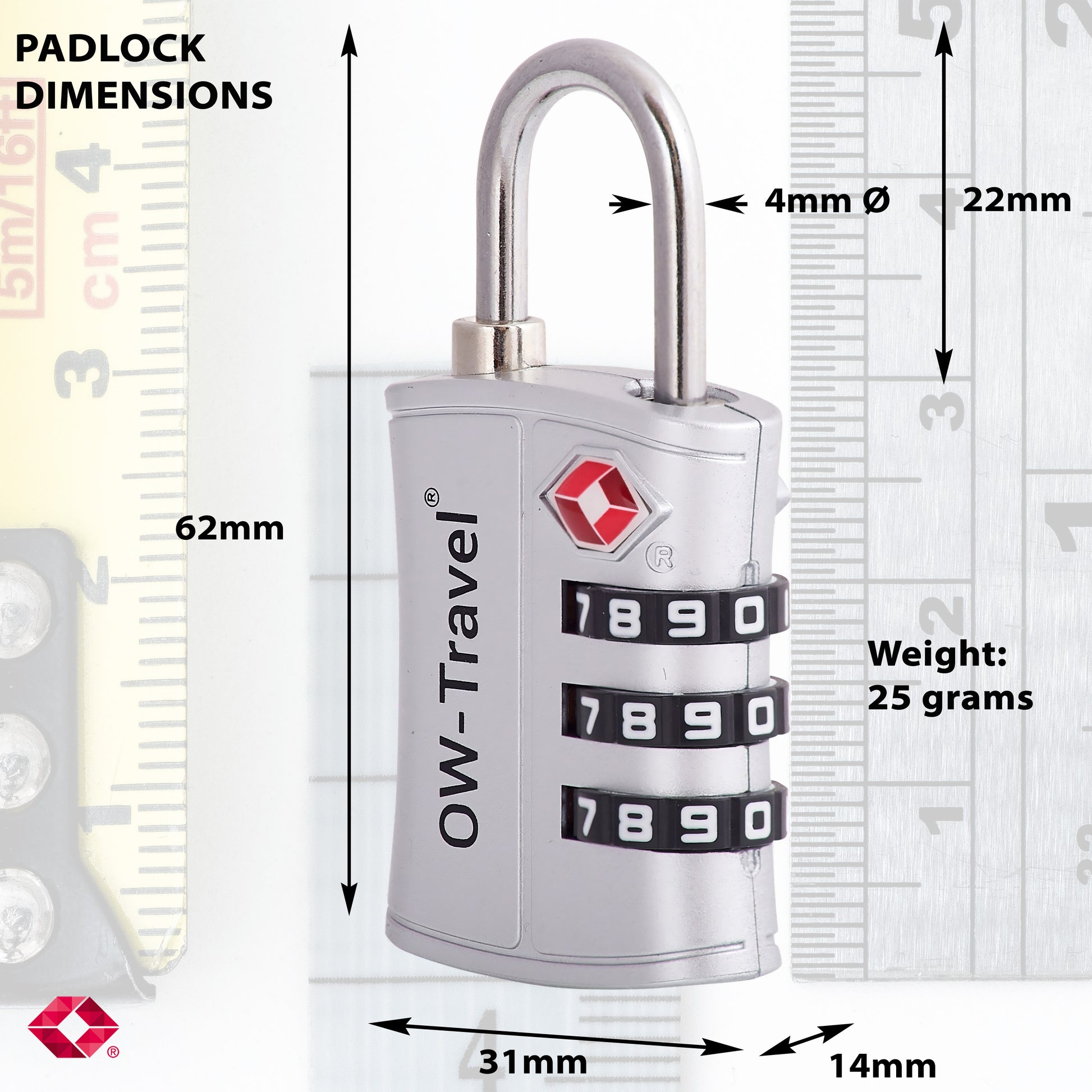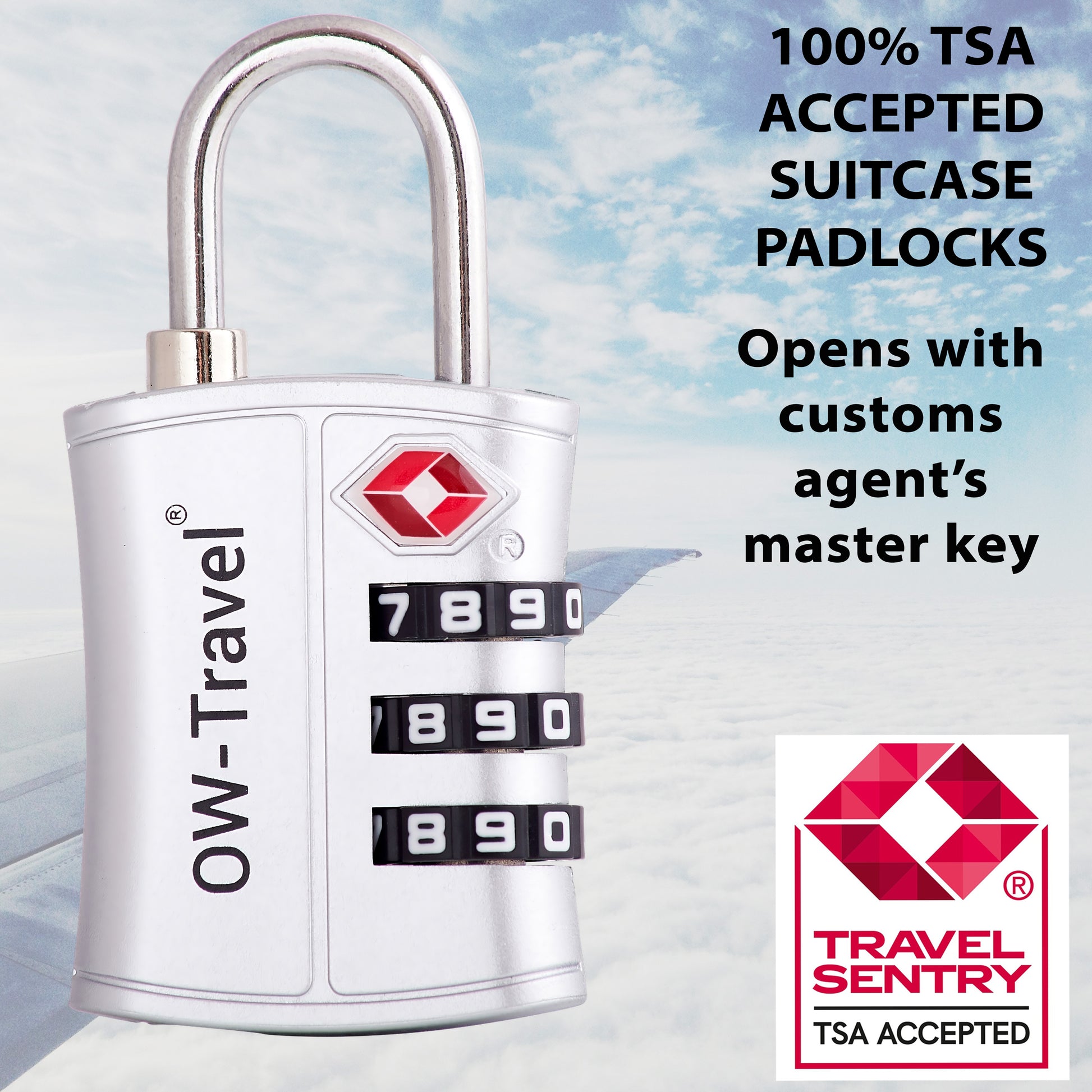【TSA Approved】TSA Accepted, Travel Sentry Approved - TSA 007 Master Key Compliant. Fly and never arrive with luggage destroyed by inspectors. Most countries have the right to open and inspect suitcases or backpacks even if that means damaging them, especially the USA. OW-Travel’s TSA combination padlock with red diamond logo ensures your travel gear can be opened by all TSA security operators.